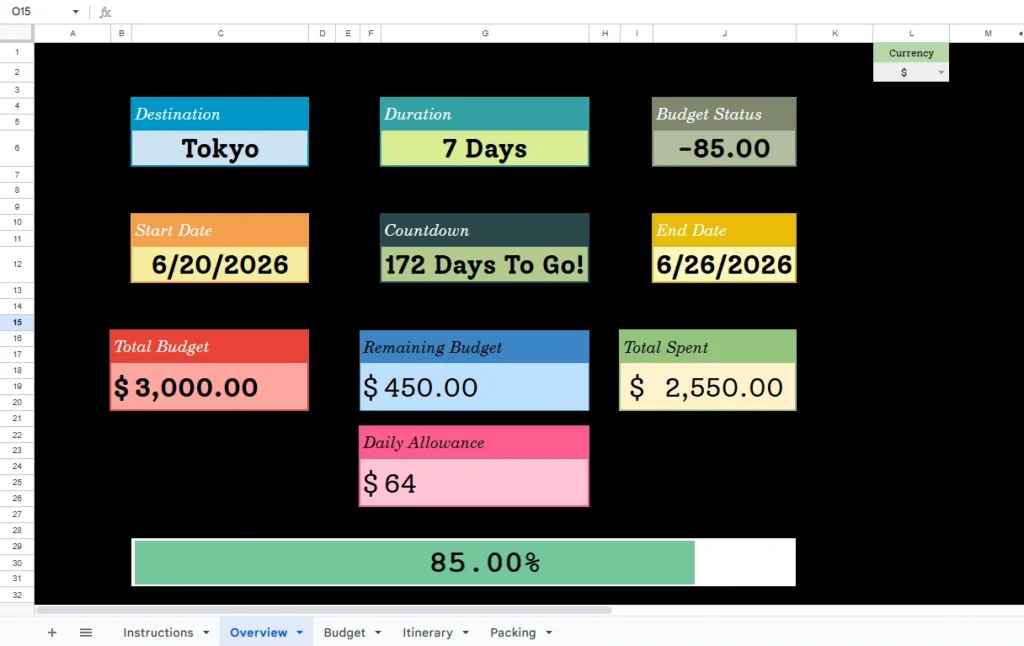 One of the biggest problems with a standard spreadsheet is the “Wall of Text.” When you list out a 14-day trip, seeing “Tokyo” typed out five times in a row makes it hard to visualize the actual structure of your journey. You lose the forest for the trees.
