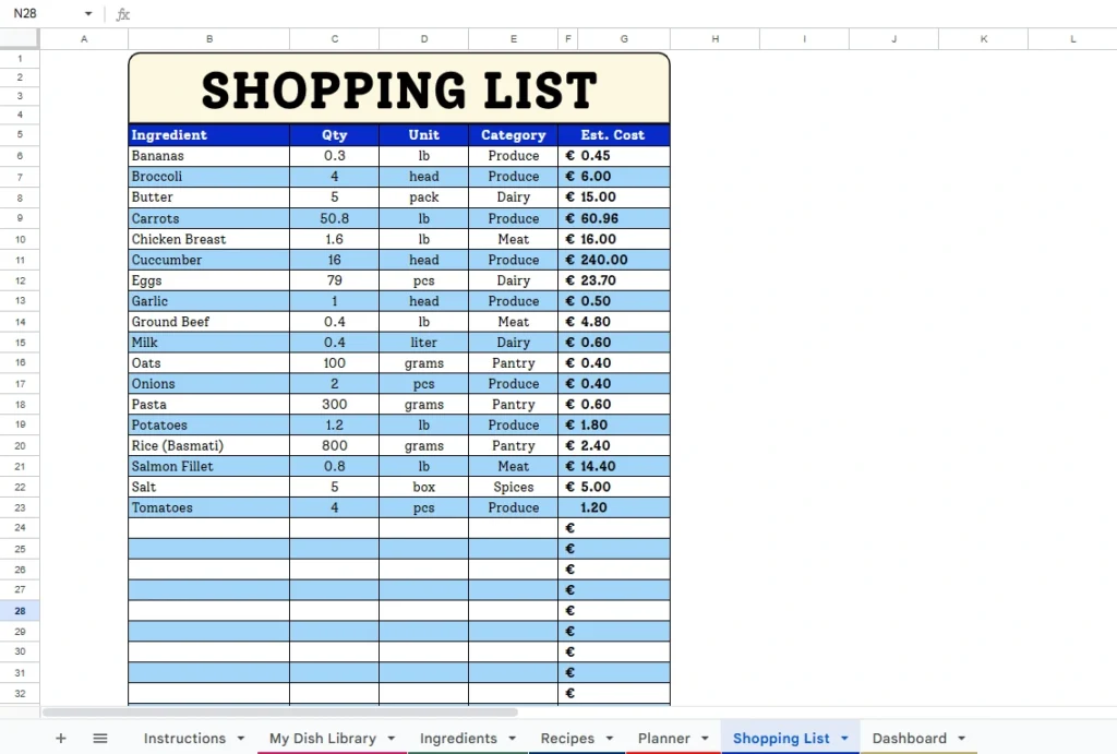 Usually, even if you are using a printed weekly meal planner template, you have to sit down and write: “Okay, I need tacos twice, so I need double the meat.” This tab automates that math.